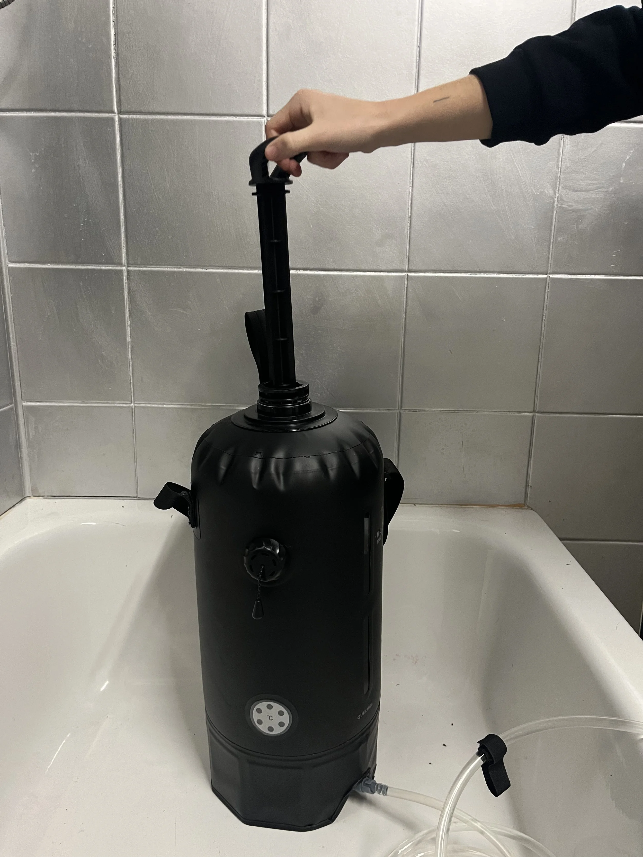 During the frost we are forced to drain the water system. An indoor camping pressure shower is available during this period. Its use is quite intuitive. You unscrew the top cap, fill the container, move the plunger up and down to create pressure inside the container and then control the water flow with the shower head. You can also fill the camping shower with hot water, which increases the comfort of showering. It can also be used for more convenient dishwashing.